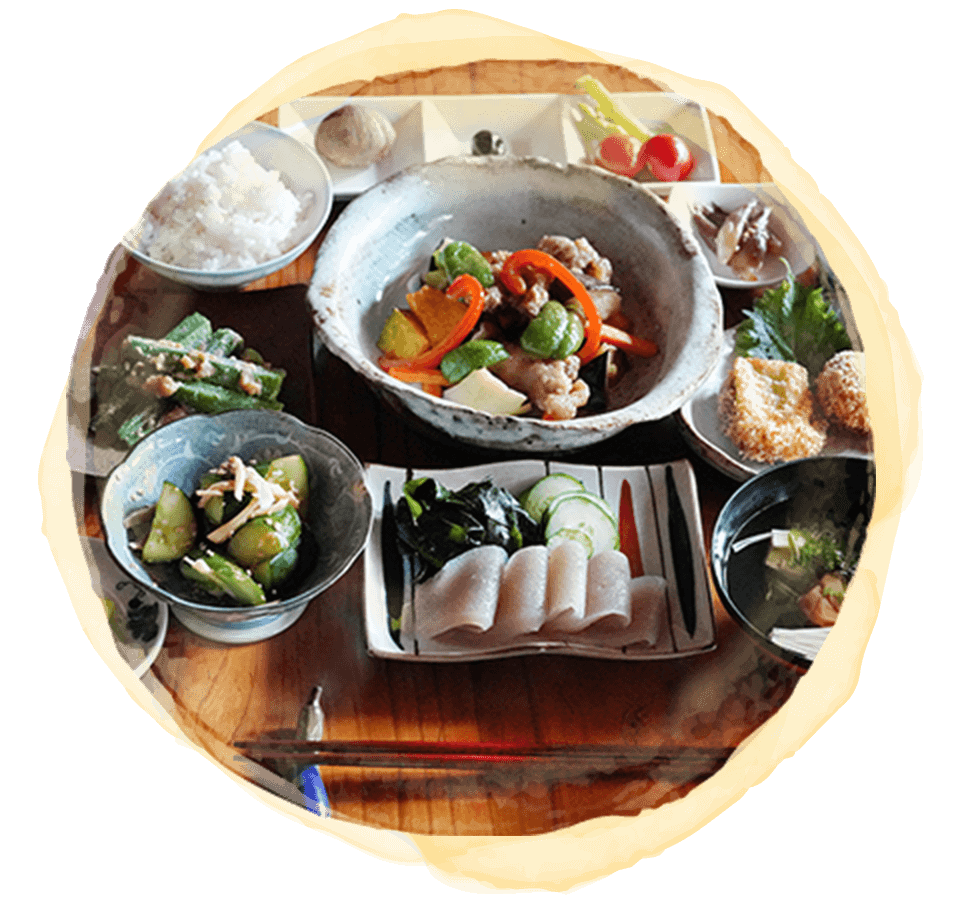 大道谷の里の自慢は、手作りの刺身こんにゃくや地域で採れる旬の食材を用いた料理の数々。春はたけのこ・山菜、夏はナスやゴーヤ、季節によって筑後地方の郷土料理“だご汁”も食卓にならびます。心もお腹も満たされる、満足の里山料理です。
